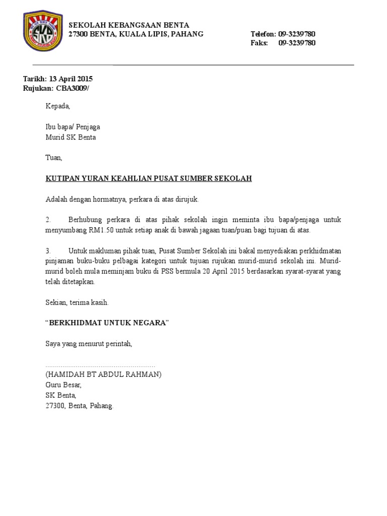 contoh surat kehilangan buku teks sekolah